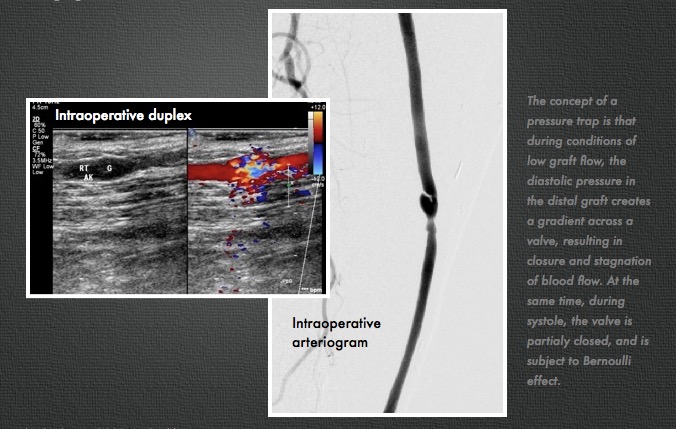 The concept of a pressure trap is that during conditions of low graft flow, the diastolic pressure in the distal graft creates a gradient across a valve, resulting in closure and stagnation of blood flow. At the same time, at the onset of systole, the valve is partialy closed, and is subject to Bernoulli effect.