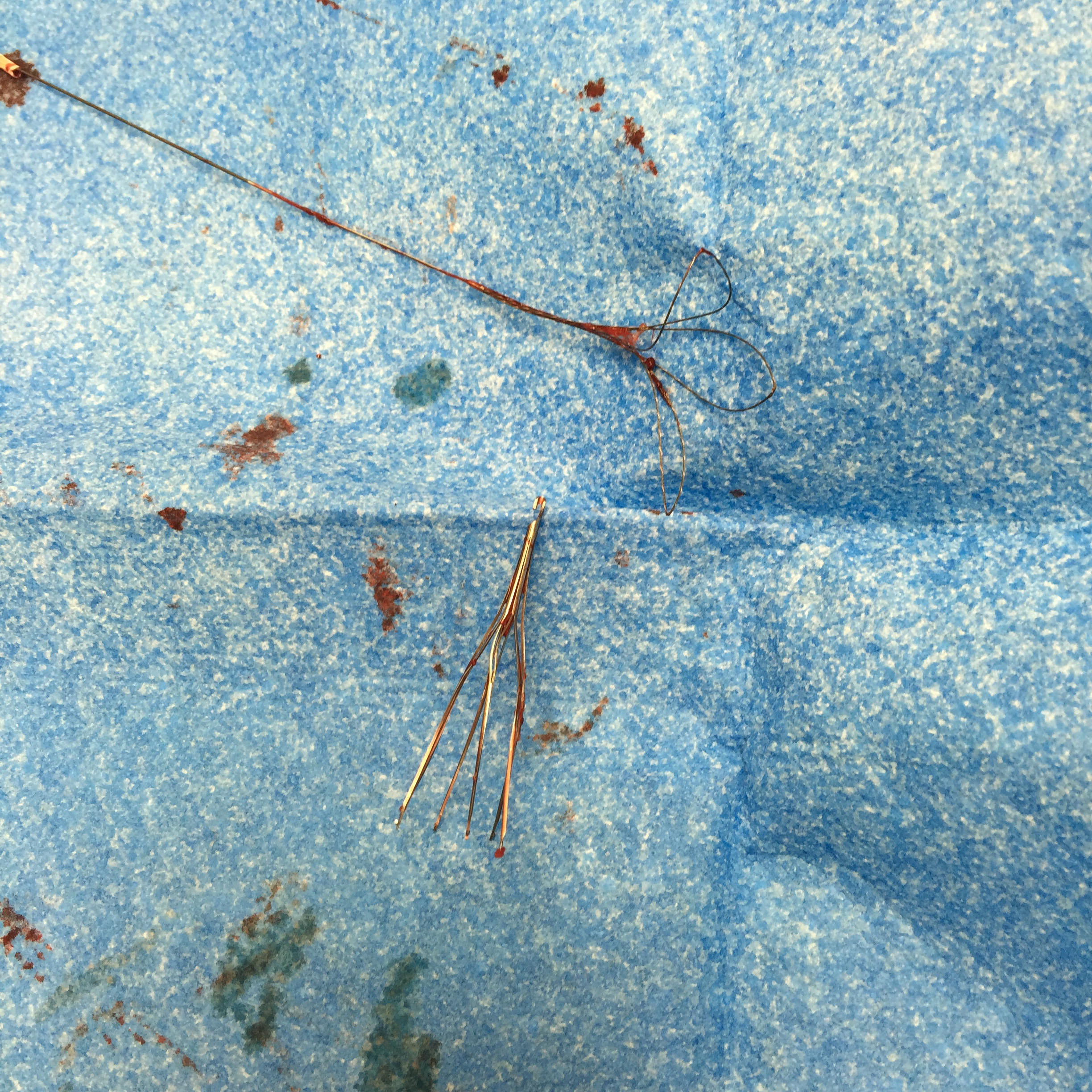 Removing filters is a serious business because leaving them in for life is not inconsequential. Typically, the period of time that the filter are required for protection exceeds the limits of retrievability recommended on the instructions for use. It is not generally understood that many filters can be retrieved years after implantation, but it is not as simple as retrieval within a few months of implantation which can be done in under 30 minutes. In patients like the one in the illustrations, several years after implantation, the filter comes out only with some patience and a little help from friends.