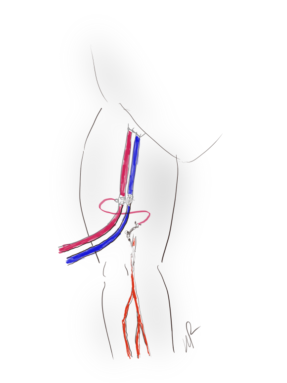 The rise of cardiopulmonary bypass life support has also given a rise to the need to keep large, obstructive cannulas in femoral arteries. ECMO cannulas are often kept in for days, and it is not uncommon to discover limb ischemia and infarction relatively late. This can be avoided by placing a distal perfusion cannula to shunt blood to the leg early in the ECMO process. The ECMO cannulas have a convenient side port to send a little flow to a 6F sheath placed in the femoral or popliteal artery. This is an established technique (reference 1, sketch below), and it works despite the modest flows achieved because it does not take much to keep the leg alive. These patients are not walking, nor are they need to heal leg wounds, so just enough blood flow means something just a little more than what they get when the common femoral artery is completely occluded by the life support cannulas. What is fascinating to me is that these shunts can pptentially help to save limbs when used as temporary extracorporeal bypasses when definitive vascular surgical care is not immediately available.