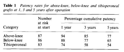 Veith FJ, Gupta SK, Ascer E, White-Flores S, Samson RH, Scher LA, Towne JB, Bernhard VM, Bonier P, Flinn WR, et al. Six-year prospective multicenter randomized comparison of autologous saphenous vein and expanded polytetrafluoroethylene grafts in infrainguinal arterial reconstructions. J Vasc Surg. 1986 Jan;3(1):104-14. doi: 10.1067/mva.1986.avs0030104. PMID: 3510323.