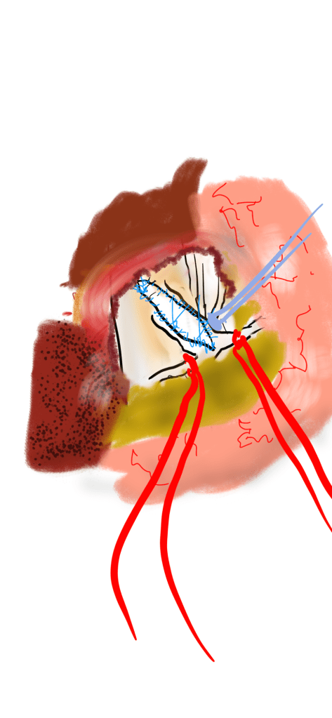 The image above shows a common femoral artery aneurysm presenting as a pulsatile mass in the right groin. The first image on left is an arteriogram (a sketch of one) that I would get prior to surgery. The patient is also suffering from pain in the right leg due to a lack of blood flow because his superficial femoral artery (SFA) is occluded and his profunda femoral artery (PFA) is open but has a blockage at its origin where the aneurysm ends. I plan the surgery and execute it. During surgery, things may pop up -good things like finding an otherwise pristine SFA filled with plaque. Removing the plaque, it becomes a great conduit for replacing the aneurysm and avoids using an expensive graft which can become infected -your own tissues fight off infection better than graft.