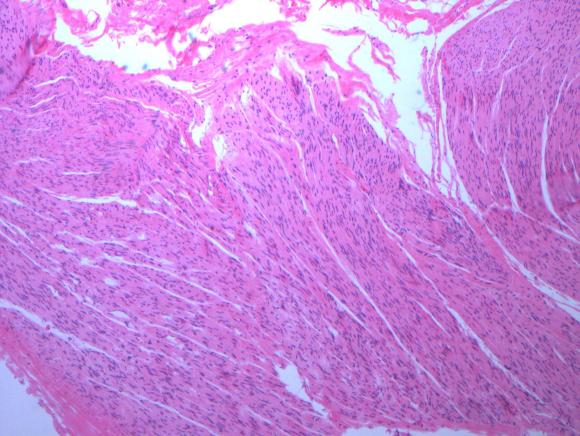 This was removed during a laparoscopic median arcuate ligament release. It was a hard white band compressed under the ligament and itself compressing the celiac axis. During the release, I grabbed a piece of these fibers and sent it for pathology under the preliminary diagnosis of celiac plexus, and it was. Described as “typical for a peripheral nerve…mostly Schwann cell nuclei in between nerve fiber.” Other micrographs in the specimen had ganglionic fibers but our pathologist wasn’t able to locate it. This is an important piece of the pathoanatomy because I believe that this is the nidus of the pain associated with median arcuate ligament syndrome, not a regional ischemia that can only occur if the celiac axis is an end artery, which can really only happen after a major exenteration like a Whipple procedure.