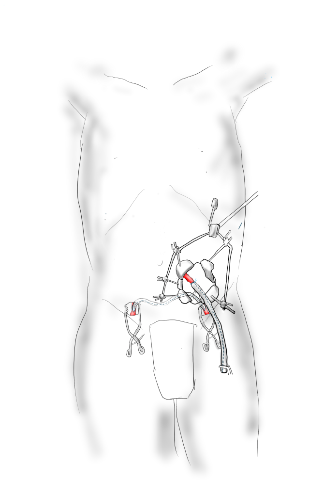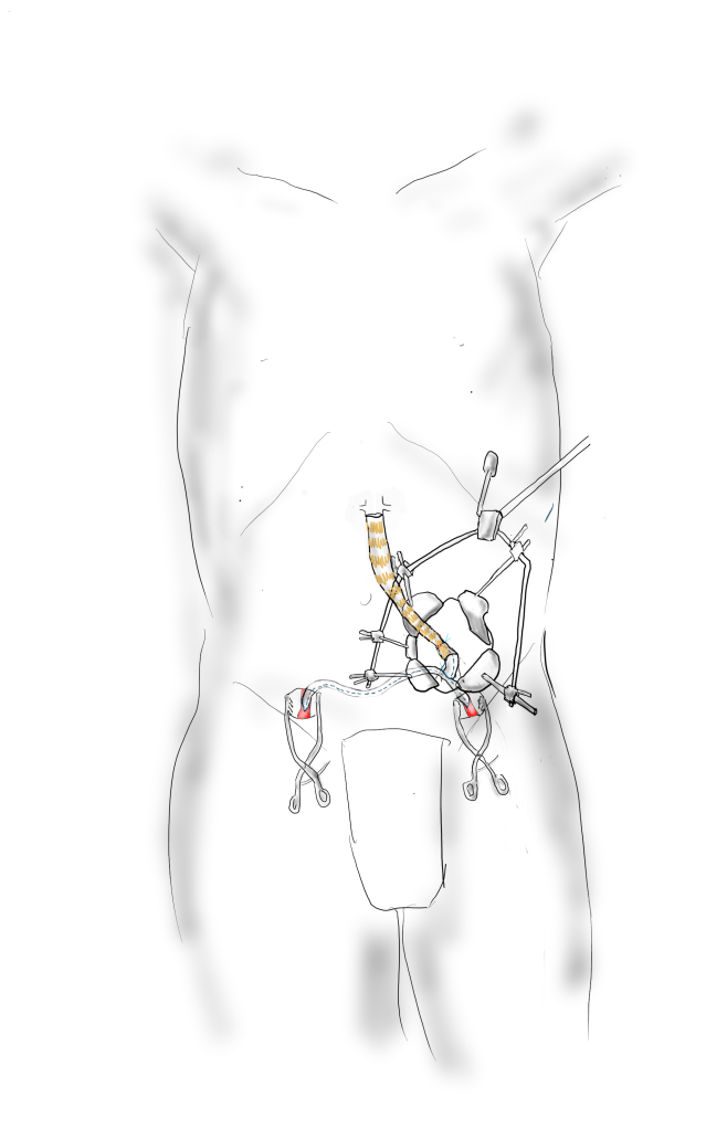 The transplant exposure facilitates a retropubic tunneling of the femorofemoral bypass which is performed first.