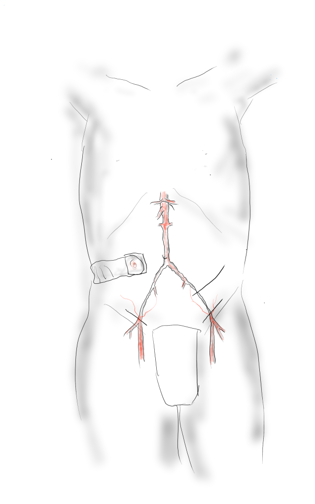 I had posted the above picture from over 15 years ago during my time in Iowa of my hybrid AUI-Fem-Fem (under unclampable 2, link). This technique came back to me as I was strategizing the upcoming aortic revascularization of a patient with iliac occlusions with the added complexity of an ileal conduit in the right abdomen. He had multiple failed prior iliac stents and failed femorofemoral bypasses -his right CIA and EIA were occluded while the left EIA had become occluded resulting in ischemic rest pain. While the picture alone is sufficient for me, it was brought to my attention by Dr. Joedd Biggs, fellow alum of the Mayo Clinic, on faculty at University of Kansas Hospital, that more detail was needed. So while resting my tired dogs, I got on my tablet and drew it out. Joedd, I present you my technique for a hybrid AUI-Fem-Fem bypass of the aorta.
