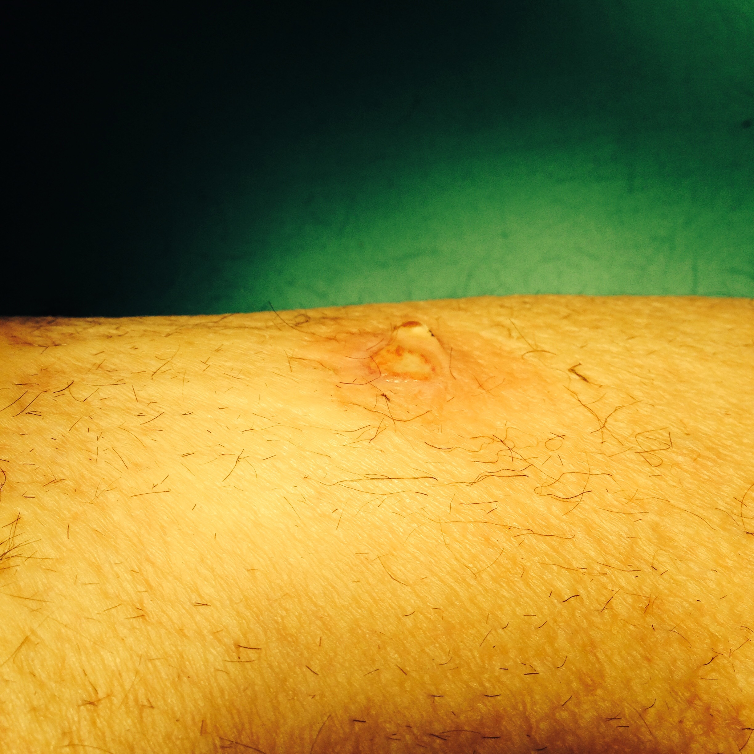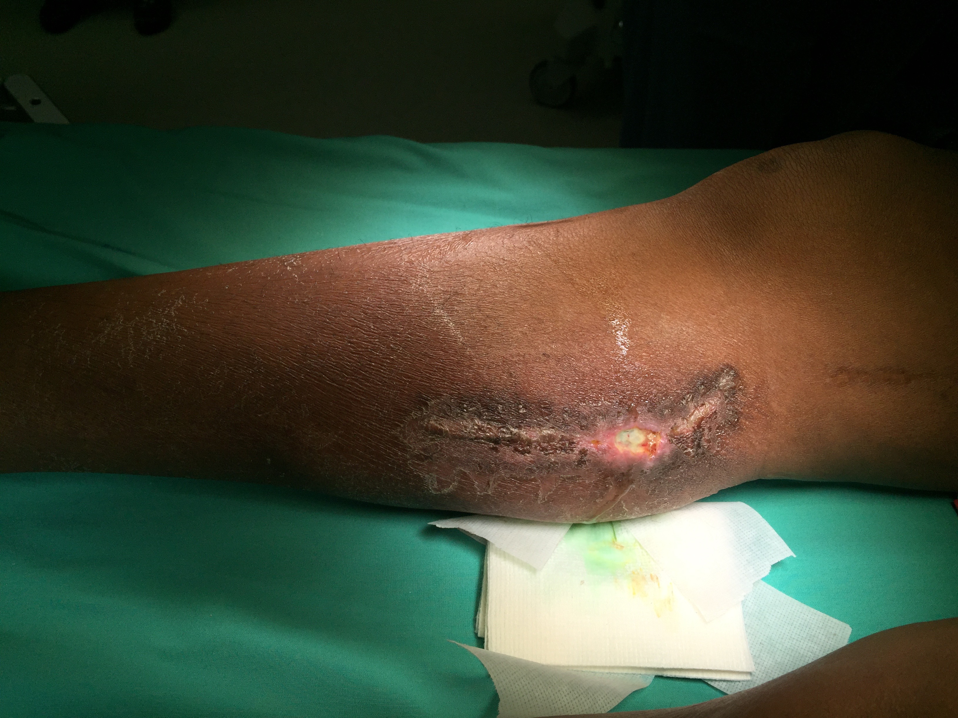 This patient had had an endoscopic saphenectomy for coronary bypass at another institution and had developed a wound infection that eventually healed, but developed a pore at the scope site that continued to drain clear fluid soaking an ABD pad hourly. This had been cauterized and sutured without improvement.