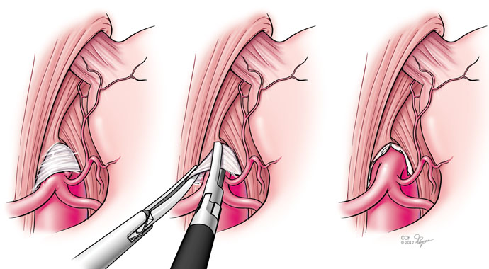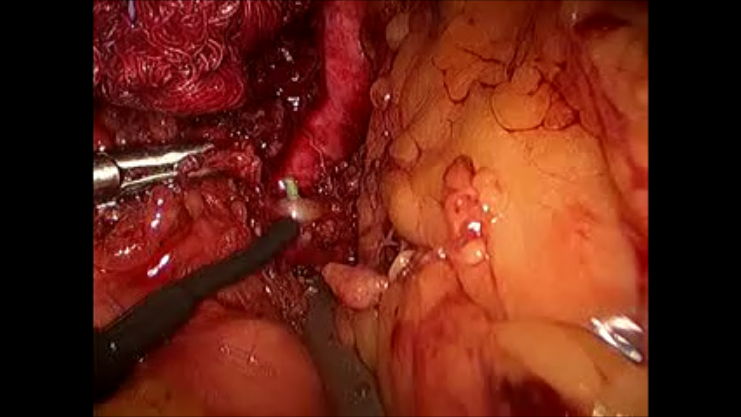 Going into the lesser sac, the crurae of the diaphragm were heavily scarred near the celiac axis. Division of these fiber was taken slowly and with the aid of both loupe magnification and a hook cautery (borrowed from laparoscopic surgery). The aorta was cleared of tissue first -it was also encased in scar tissue. The dissection going distally was made difficult by inflammatory scar tissue as well, but several large nerve trunks were encountered and divided. The celiac axis was atretic and small within this scar tissue, but was released down to the trifurcation.