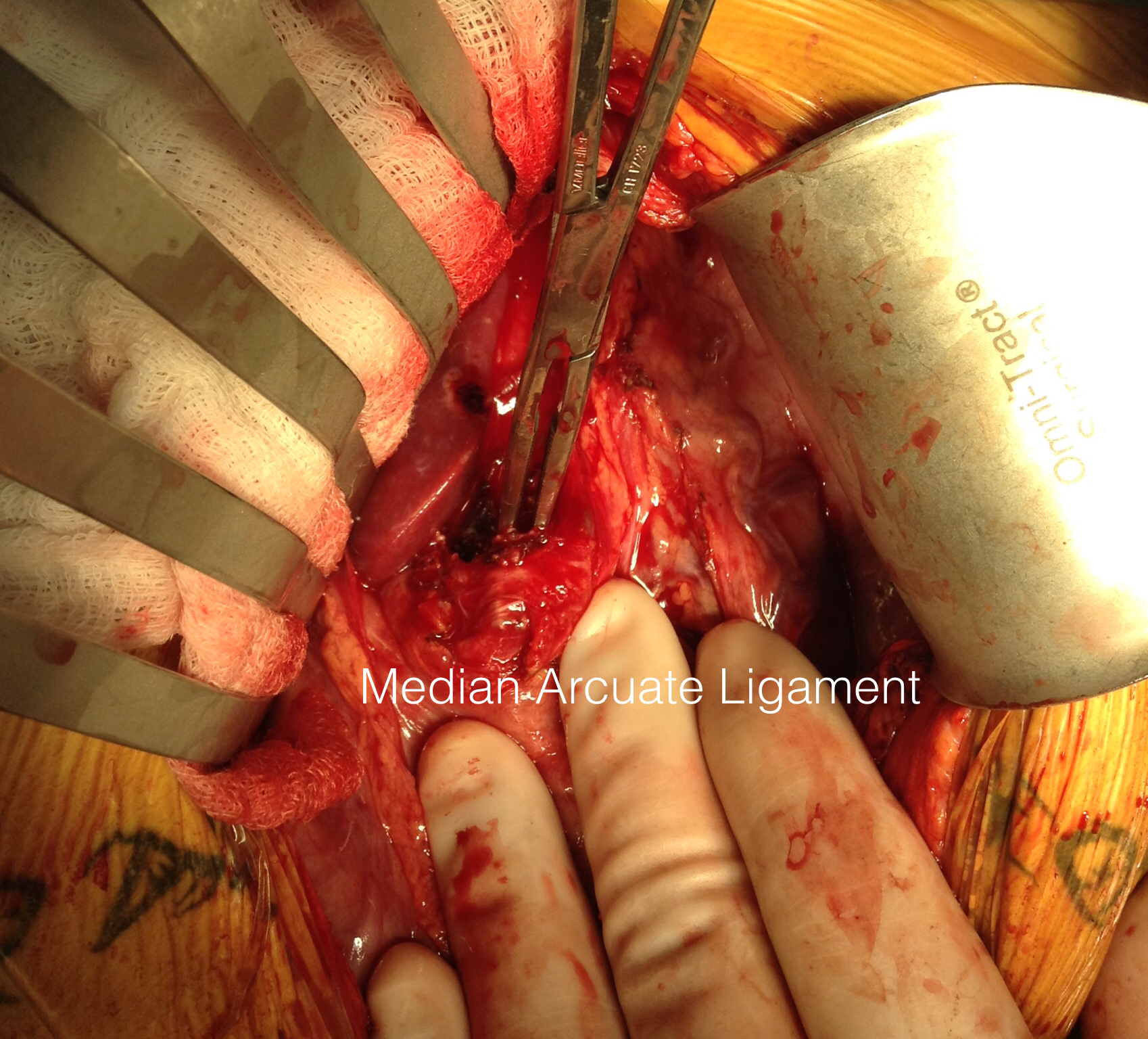 The chevron exposure heals well and is well tolerated and offers perfect exposure. While I was doing it, it occurred to me that a laparoscopic bypass is technically possible, and may be preferred to the long incision. Recent multi-institution study of MALS treatment would suggest laparoscopic approach offers a lower complication rate compared to open surgery (ref 2.)