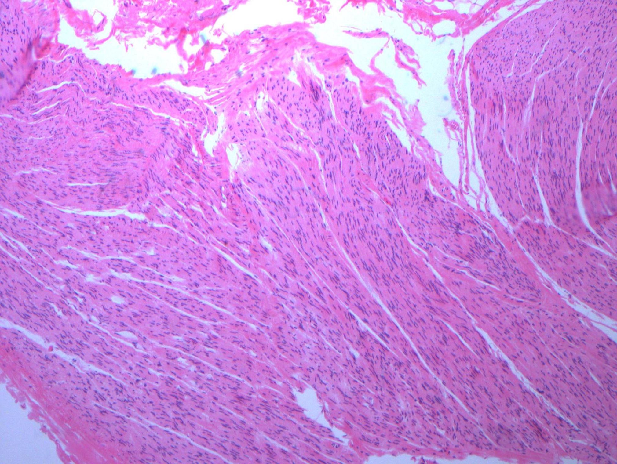 This was removed during a laparoscopic median arcuate ligament release. It was a hard white band compressed under the ligament and itself compressing the celiac axis. During the release, I grabbed a piece of these fibers and sent it for pathology under the preliminary diagnosis of celiac plexus, and it was. Described as “typical for a peripheral nerve…mostly Schwann cell nuclei in between nerve fiber.” Other micrographs in the specimen had ganglionic fibers but our pathologist wasn’t able to locate it. This is an important piece of the pathoanatomy because I believe that this is the nidus of the pain associated with median arcuate ligament syndrome, not a regional ischemia that can only occur if the celiac axis is an end artery, which can really only happen after a major exenteration like a Whipple procedure.