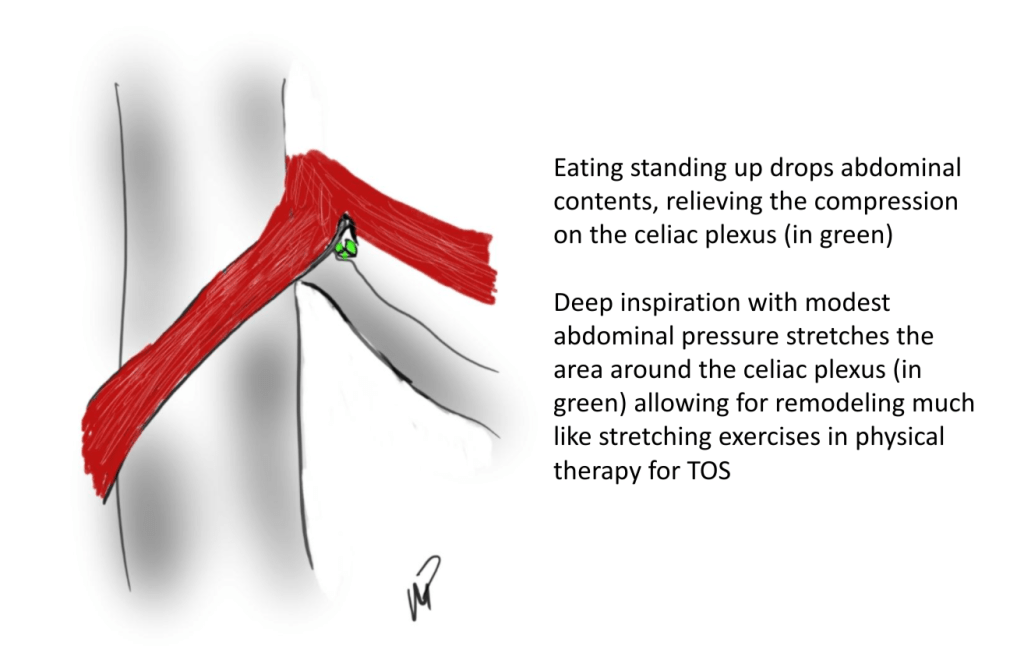 The patient is a young woman who presented with classic symptoms and findings of median arcuate ligament syndrome (MALS). She avoided food because eating triggered severe pain in her upper abdomen. Over a year, this resulted in 15 pounds of weight loss. As a result, she no longer had the energy to work or exercise. She had an extensive gastrointestinal workup including blood work (LFT’s, amylase, cholesterol panel), abdominal CT scan, and upper endoscopy which were normal except for the finding of narrowing of the celiac axis due to compression by the median arcuate ligament. Examination was notable for upper abdominal pain exacerbated by pressure and seated, hunched-over posture. Unfortunately, due to her health insurance, surgery was not covered and she did not want any. So I recommended she try the following.