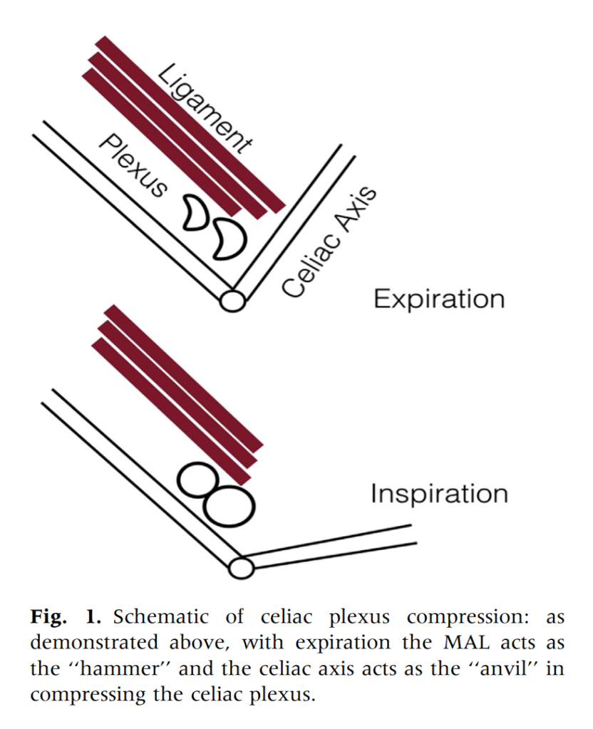 We have postulated that MALS is a nerve compression syndrome of the celiac plexus by the median arcuate ligament (reference). There are two consequences to MALS, neither of which is mesenteric ischemia. The first is this compression of the celiac plexus with injury resulting in inflammation and fibrosis, resulting in further compression and a neuropathy of the celiac plexus. This neuropathy triggers aberrant pain sensations in response to eating. The other consequence is remodeling and injury due to arterial compression. The celiac axis can develop post-stenotic dilatation, growing large enough to be considered aneurysmal. The compression can damage the intima resulting in dissection. The artery can be injured and a pseudoaneurysm can develop. Finally, the aneurysmal segments may develop thrombosis and be the source of thromboembolism, usually to the spleen. Even when the celiac axis clots off, unless there has been resectional surgery such as a Whipple or splenectomy, the stomach gets enough collateral flow that ischemia is rare when celiac axis occlusion occurs. So similarly to thoracic outlet syndrome (TOS), there is a neurogenic MALS and an arterial MALS.