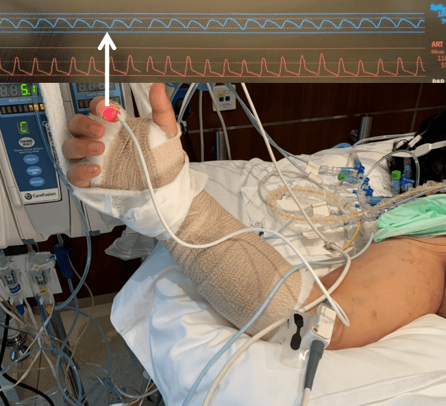 In the morning, taking down the dressing, and re-compressing, there was now a radial artery signal and the fingers were a much improved color. The pulse-oximeter waveform was near normal. As an aside -the pulse oximeter uses the same technology as the digital photoplethysmography for generating toe waveforms in the vascular lab -ie. a vascular lab at every bedside! We have collected and are analyzing the data on this for publication.