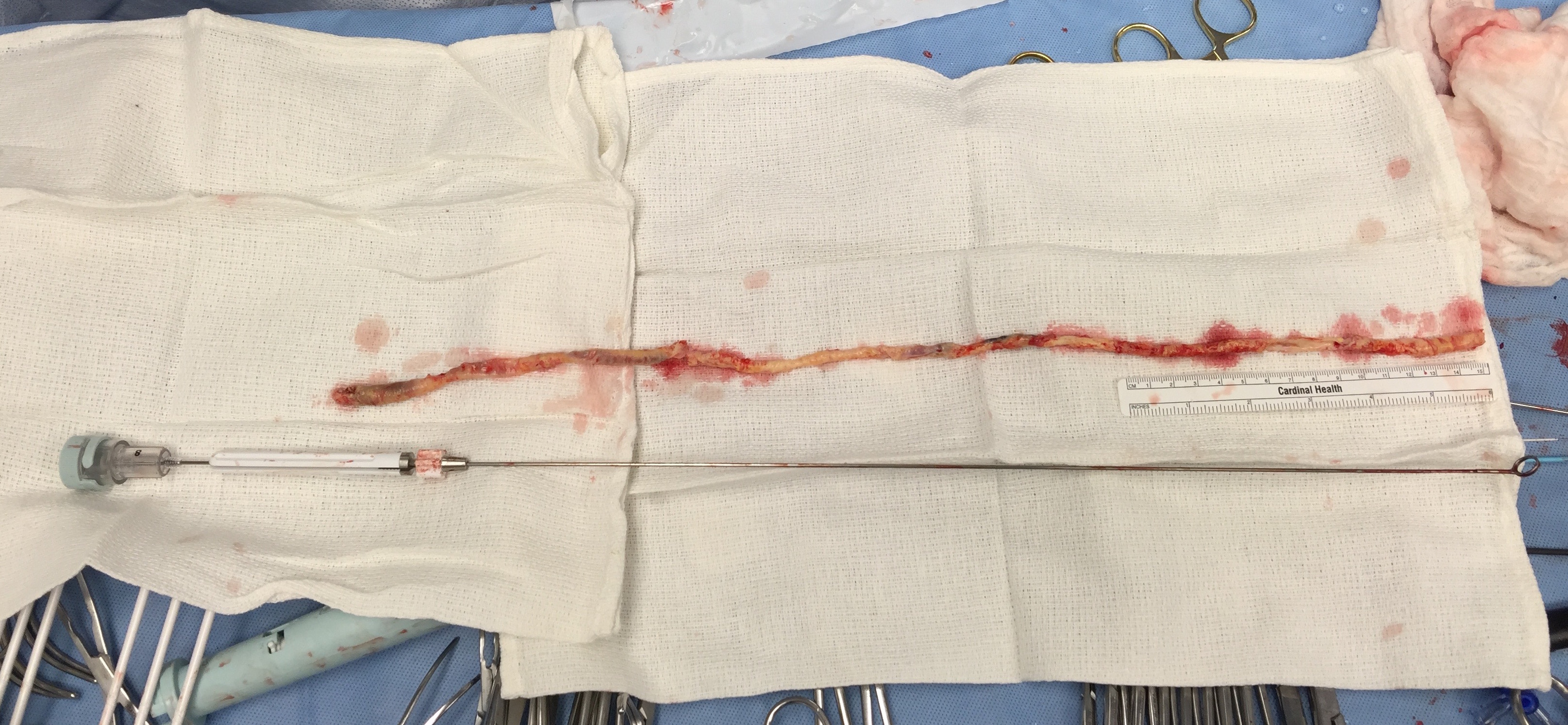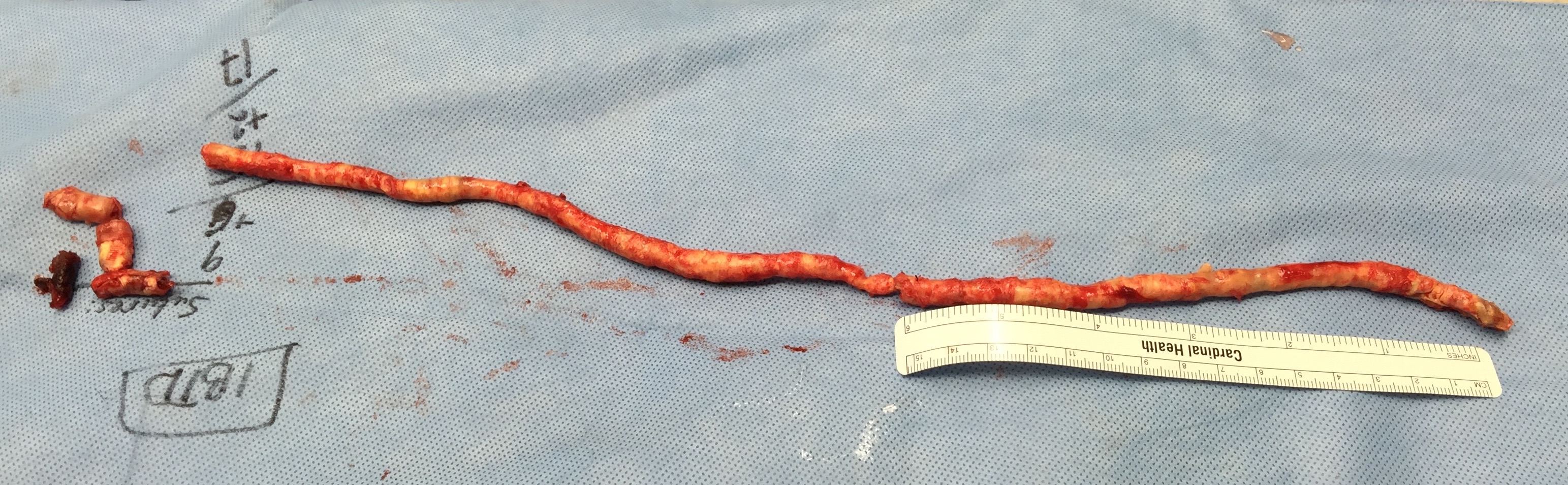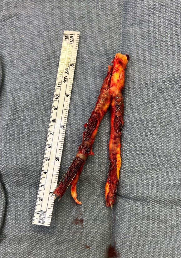 The specimen shows that the adventitia remains separated from the stents by the plaque. I rarely use tacking sutures as I feel a properly performed endarterectomy results in no plaque or well adherent mild plaque.