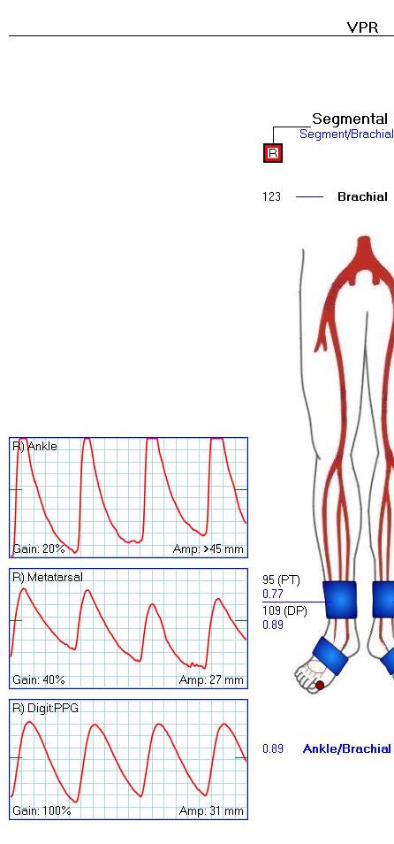 On examination, she was a large woman with no femoral pulses, but signals could be obtained in her popliteal and tibial arteries. Her PVR’s showed inflow disease and poor flow at the feet.