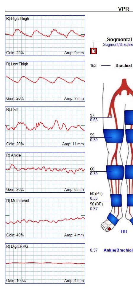 At followup several months after the procedure, the patient was walking well without claudicating and was ready to return to work. PVRs showed excellent flows down to the toes.