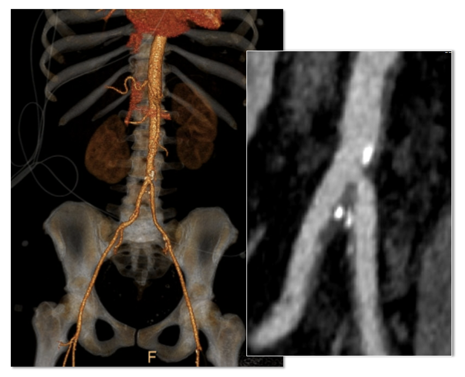 Her baseline CTA in workup of her claudication the year prior to getting stented shows the aorta and iliacs, while open, are small, with aortic lumen diameter reaching 10mm and common iliac lumen diameter at 6mm with diffuse atherosclerosis (below).