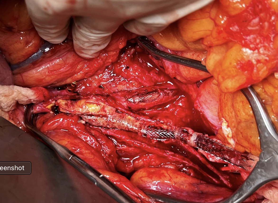 The aorta above the bifurcation was prepared for clamping. This involves circumferential exposure as I prefer a transverse aortic cross clamp. The lumbar arteries are clamped with bulldogs or aneurysm clips. The right external iliac well beyond the stent is controlled and the internal iliac is exposed and controlled. On the left the internal and external iliac arteries are expose and controlled.