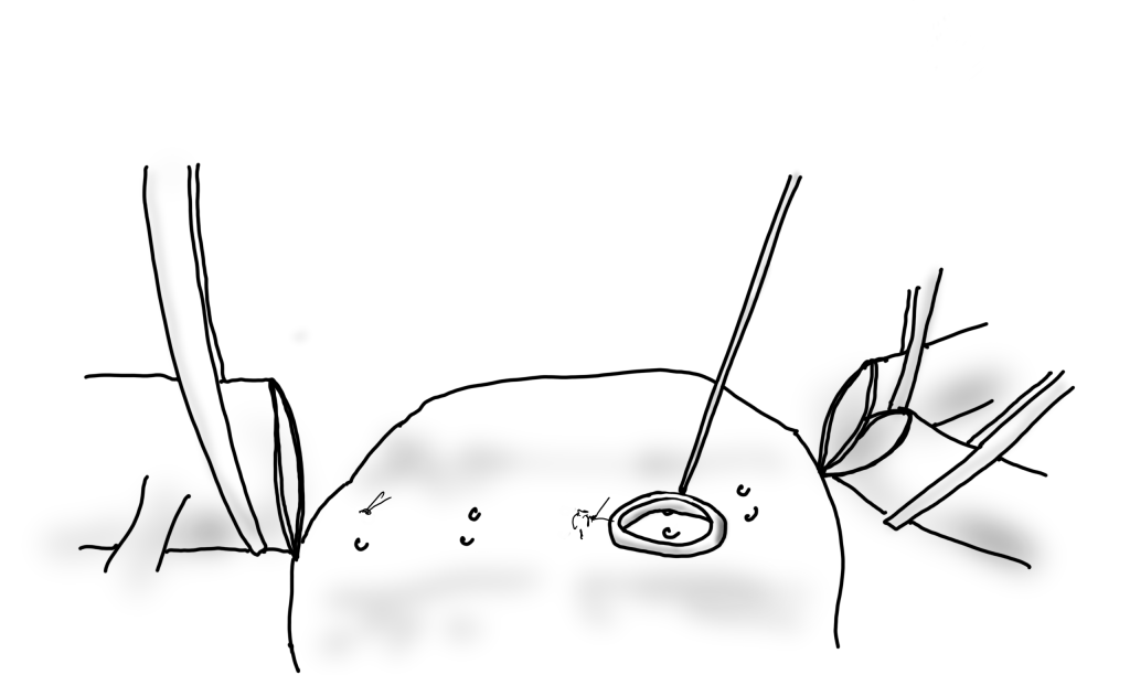 The Park Clamp isn’t a true clamp, but rather a compressor. It was designed initialy for the troublesome venous bleeding. It is a ring with ridged edges to provide grip securely welded to a handle. It allows for circumferential compression of tissues, allowing for hemostasis while creating a open space for suturing. The picture above are my colleagues from CCAD -Drs. Andres Obeso and Redha Souilamas perfoming a partial pneumonectomy. The staple line on the artery was bleeding and this can be troublesome, and may require conversion to thoracotomy. The Park Clamp was inserted and provided excellent hemostasis (below).