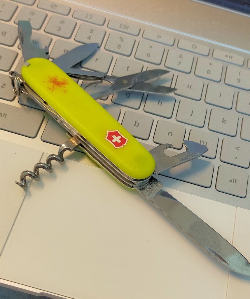 9. Swiss Army Knife -the first one I got was as a graduation gift from my dad, thought technically not a gift as superstition dictated I purchase it from him for a dollar, it was the same as this one which is currently my fourth, bought at a Boy Scout camp for about $10. I keep one in my checked luggage for use at my destination for opening bottles, uncorking wine, cutting salume and cheeses, tightening screws, and when the occasion arises, performing an appendectomy (need a hotel sewing kit). This one also has tiny forceps and a toothpick.
