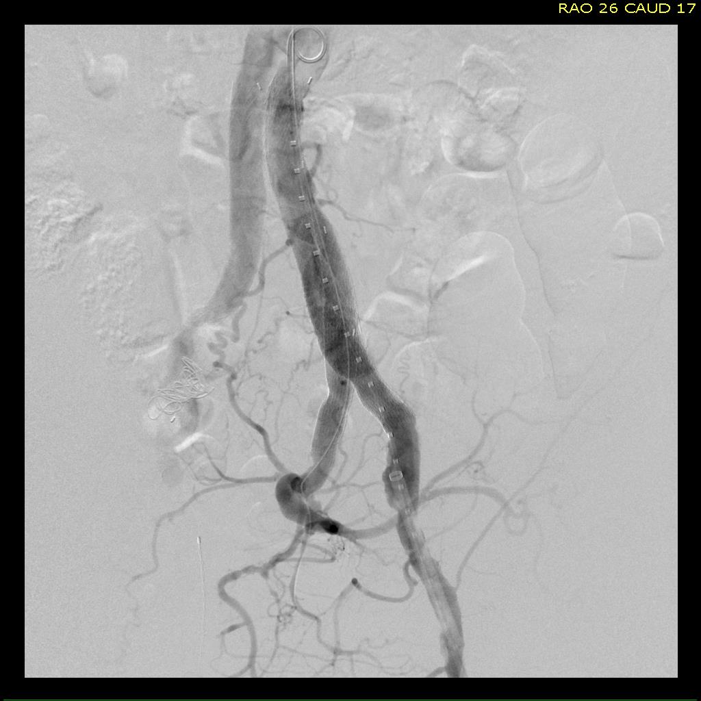 The AFX graft limb seems to adapt to the presence of the parallel “sandwich” graft which is deployed second and ballooned last. In followup, there was shrinkage of the common iliac artery aneurysm sac and no endoleak.