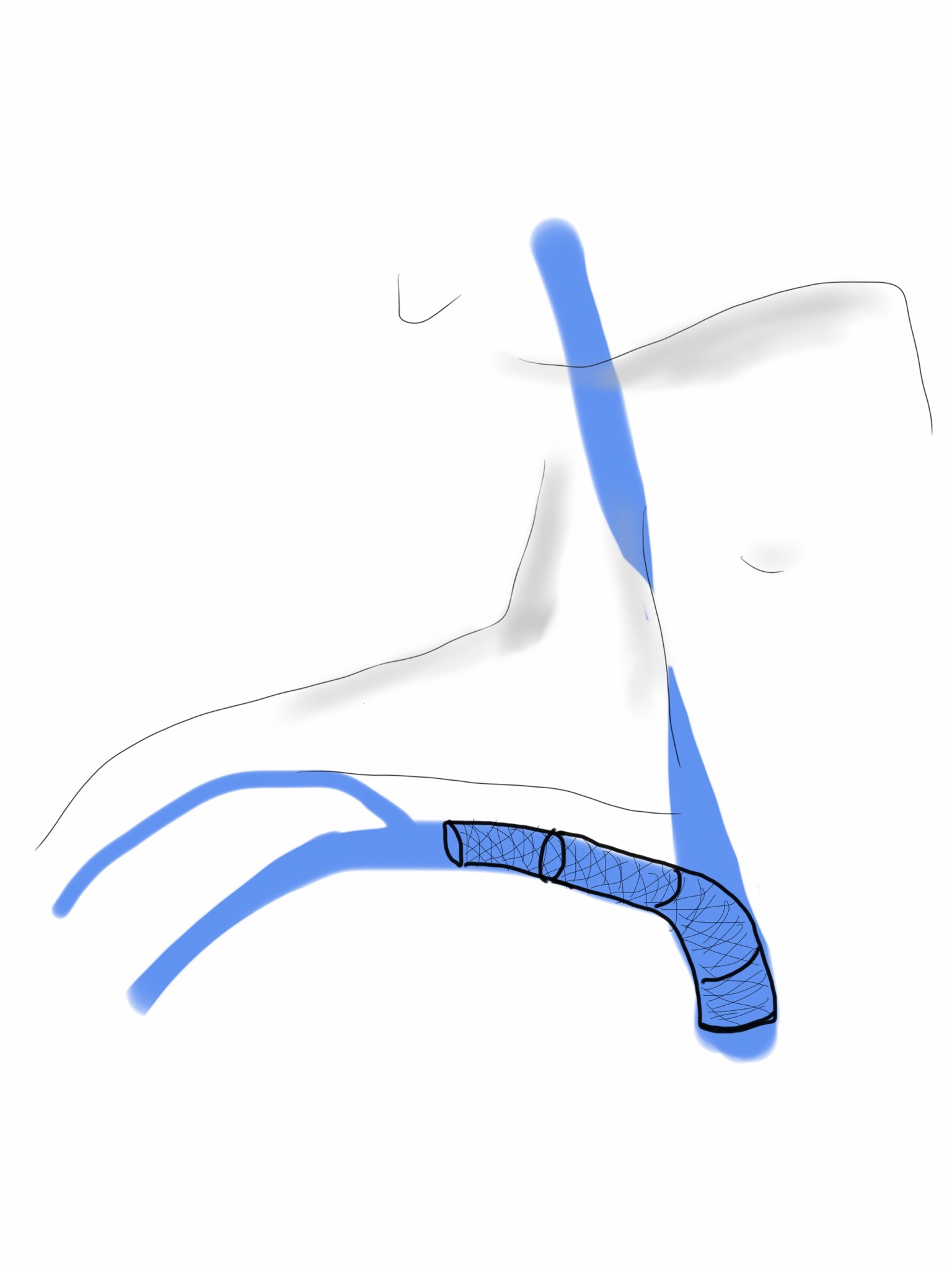 Any revascularization relies on the choice of inflow, outlow, and conduit. In endovascular revascularizations, the conduit is the previously occluded vessels, but in this instance, because of the infected grafts, there was neither continuity, nor a good option even if there was as the common femoral artery is a terrible recipient of endovascular therapy. The options then devolve to choosing an inflow. The axillary arteries are technically easiest to access and manage and form the basis of treatment of high risk patients requiring limb salvage who have no endovascular options. The axillofemoral bypass is given a bad reputation of having a poor patency, but the key is the quality of the vessels and the number of potential tension, compression, and kink points. I think the reason why the axillary to anterior tibial bypass lasted for four years in the first patient had to do with his immobility, and the pristine nature of the anterior tibial artery -the only patent vessel below his umbilicus. Here to, the inflow disease appears to have spared his right popliteal artery and his left superficial femoral artery.