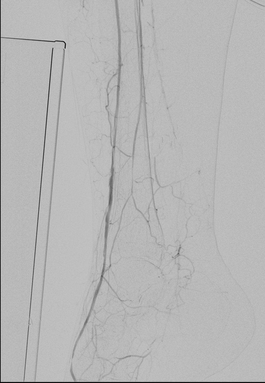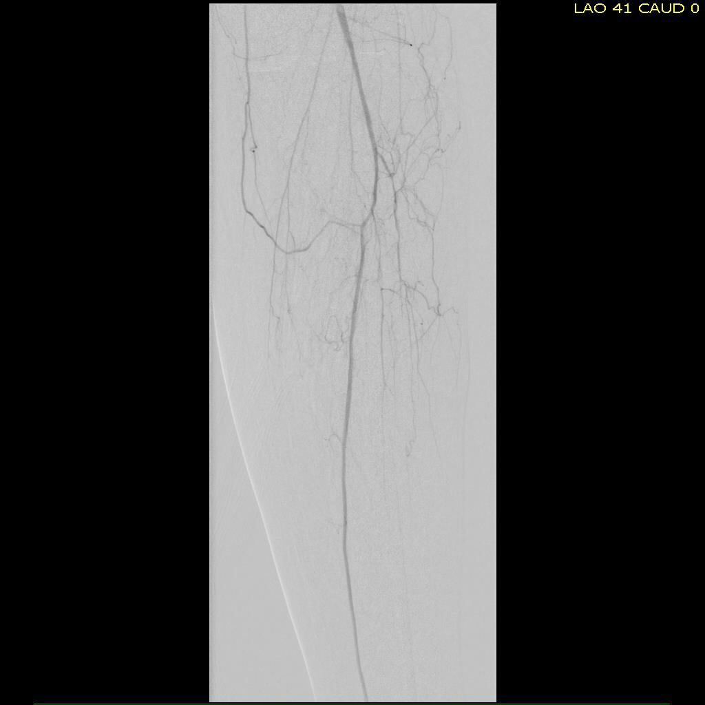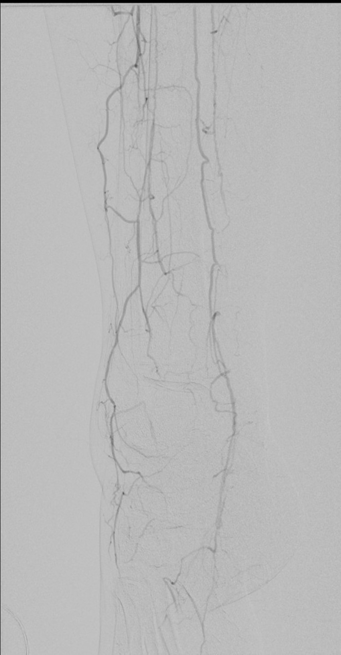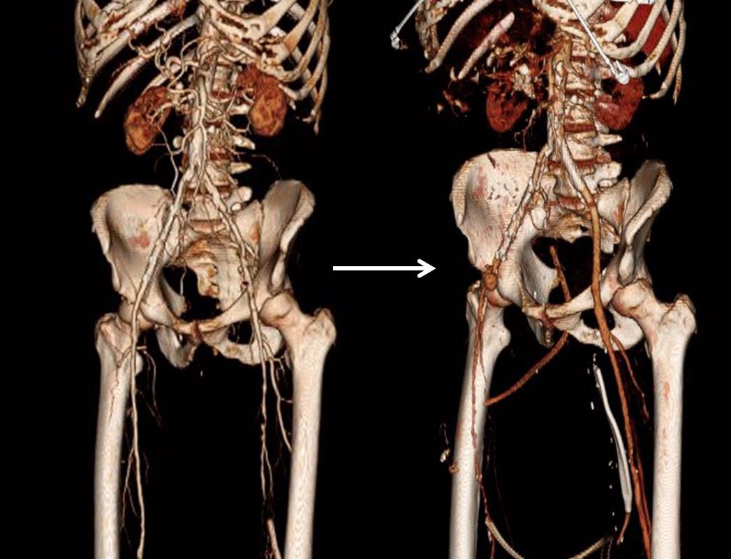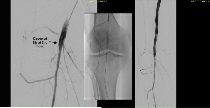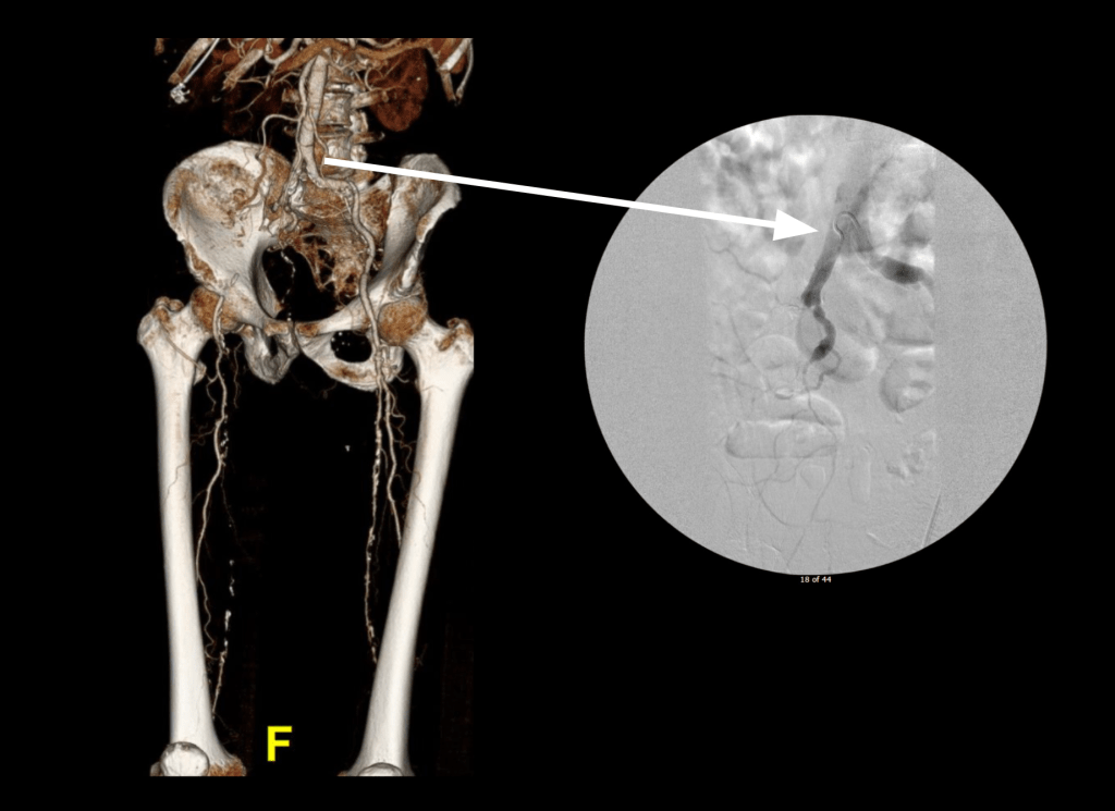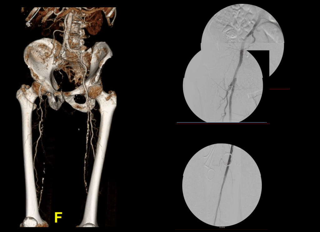 Let me show you one of the first cases I did after returning to Cleveland. I am now practicing at Fairview and Avon Hospitals, premier flagship hospitals in the Cleveland Clinic fleet, on Cleveland’s west side, and a patient arrived while I was on call with sudden onset of pain in his leg from a lack of blood flow. He had occlusive atherosclerotic plaque extending from his external iliac artery to the above knee popliteal artery causing ischemic rest pain.