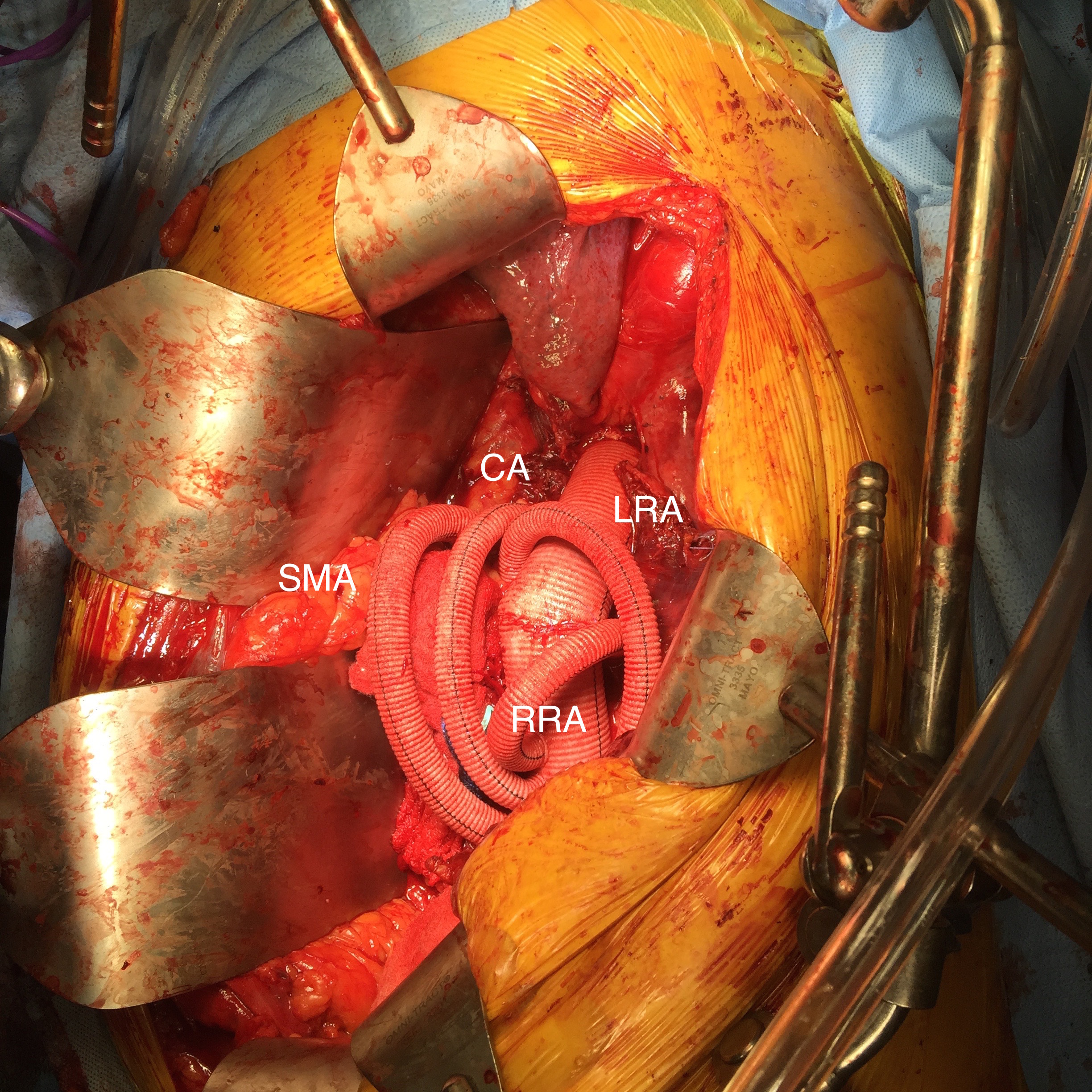 - Time -Laying the stent graft across the celiac and SMA origins starts a warm ischemia clock. The liver and intestines, in my reckoning, should be able to tolerate the 2 hours of work to get the bypasses working. Cardiopulmonary bypass may give you less ichemia but at the metabolic cost of the pump time. These negative factors add up, but were surmounted by the fact that early control of hemorrhage was achieved. Stopping the bleeding and restoring flow are the core functions of vascular surgery.